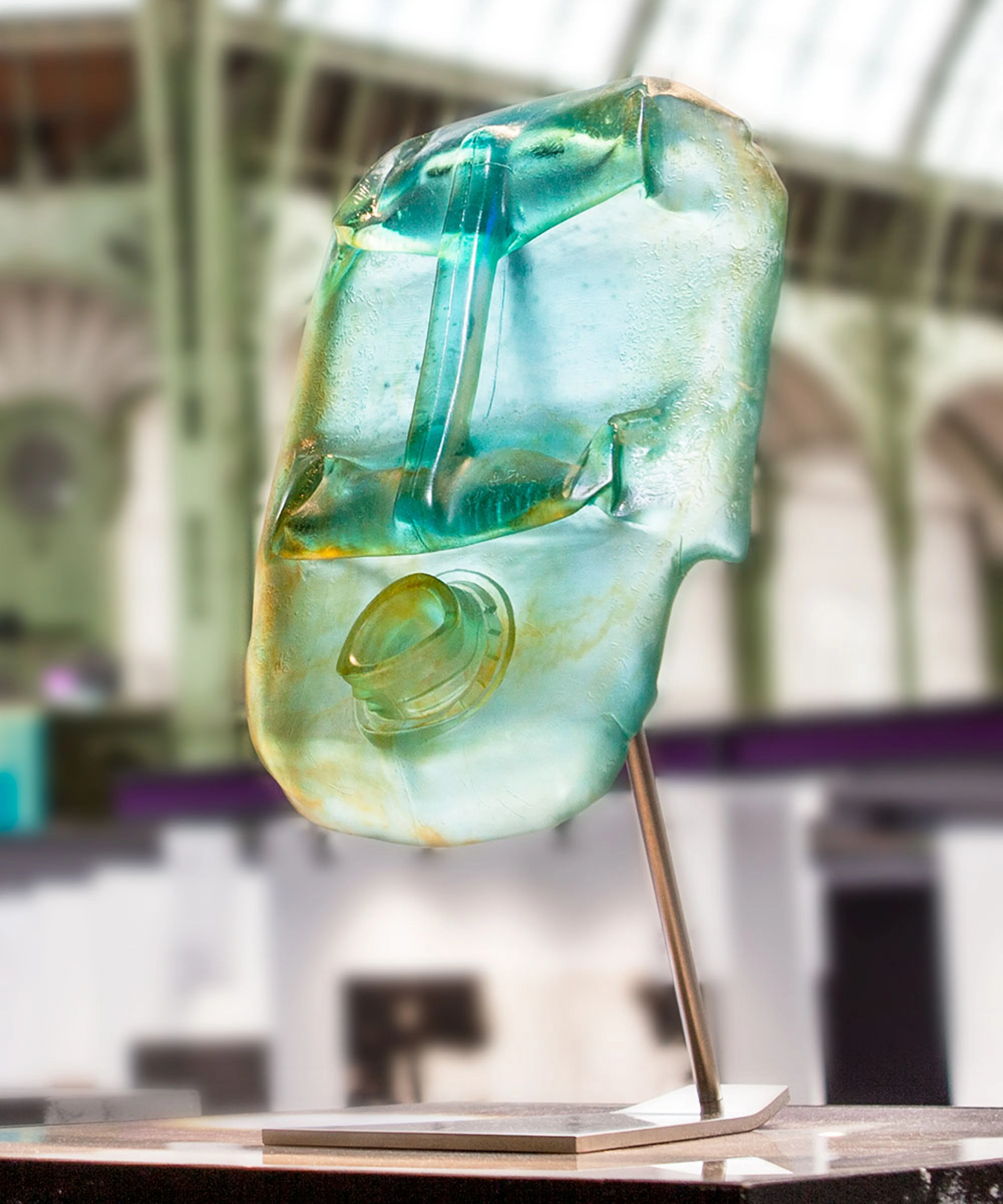 Sculpture Daum 'Blue Oil Head' par Romuald Hazoumé, un éclat de couleurs pour une présence saisissante.
